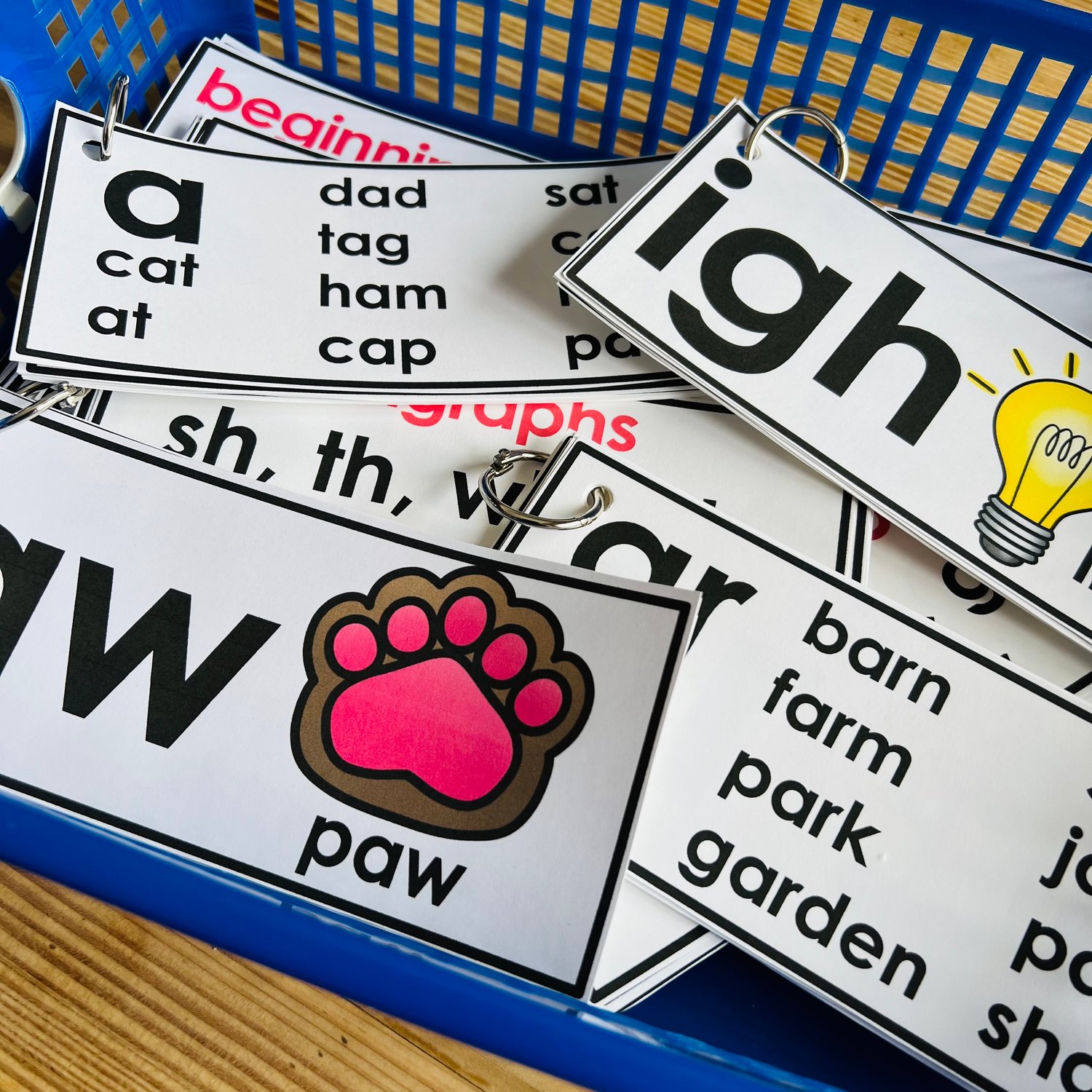 I hope you love these phonics flashcards as much as I do. I like to use them during small group instruction when we are discussing a phonics pattern. I simply reach into the basket and pick the cards out that relate to what we are learning and we begin to review.