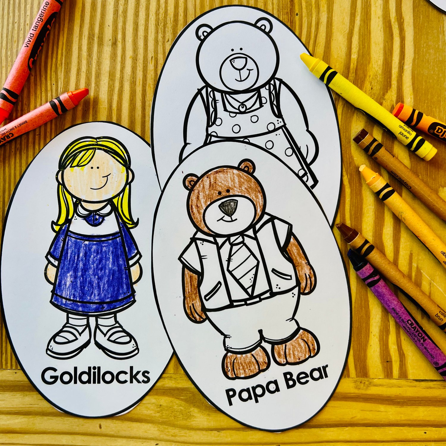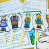 The puppets or name tags are ready to be cut out and come in color and in black and white. Apply a ruler, stick or tongue depressor to the back of the characters and they will be all ready for your students to put on great puppet plays or reader’s theater for each other.