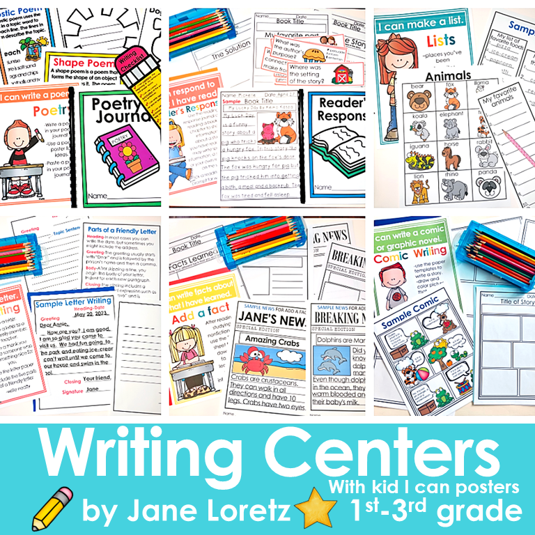 This unit includes 10 different writing centers and includes posters with directions, samples, writing ideas or prompts and the paper that your students need.